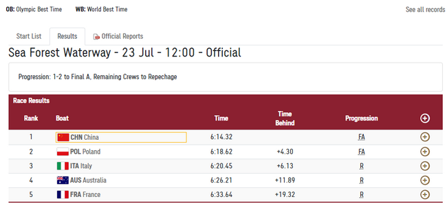 7月23日上午,东京奥运会赛艇项目展开争夺,女子四人双桨预赛,陈云霞/张灵/吕扬/崔晓桐以6分14秒32获得第一,晋级决赛。