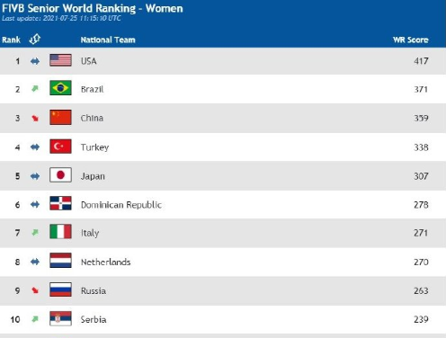 7月25日,东京奥运会女排小组赛卫冕冠军中国队首秀0-3惨败给土耳其后,国际排联更新了最新的世界排名。中国损失17分,从第二掉到第三,被巴西反超,土耳其则增加16分,继续排名第四。今天获胜的意大利和塞尔维亚也分别上升至第七和第十,俄罗斯则降至第九。
