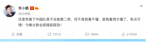 赛后,昔日中国体操名将、奥运冠军李小鹏发微博表示:“还是恭喜下中国队男子全能第二吧,哎不是我看不懂,是我看得太懂了,有点可惜!今晚分数全部提前踩到! ”